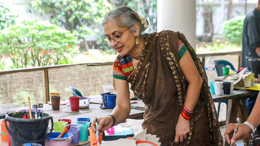 চারুকলায় নবীনদের সঙ্গে রং-তুলিতে মগ্ন বিপাশা হায়াত