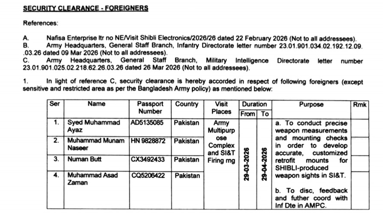 প্রতিবেদনে বলা হয়, সম্প্রতি পাকিস্তানের একটি বেসরকারি প্রতিরক্ষা কোম্পানির প্রতিনিধিত্বকারী চার সদস্যের একটি দল ঢাকায় এসে বাংলাদেশ সেনাবাহিনীর বিভিন্ন স্থাপনা পরিদর্শন করেছে। গত ২৯ মার্চ তারা সিলেটের জালালাবাদ সেনানিবাসে অবস্থিত স্কুল অব ইনফ্যান্ট্রি অ্যান্ড ট্যাকটিকস এবং সেনাবাহিনীর মাল্টিপারপাস কমপ্লেক্স পরিদর্শন করে।