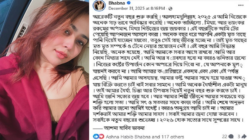 মেলবোর্ন, ৩ জানুয়ারি- নতুন বছরে নিজের অবস্থান স্পষ্ট করেছেন ছোটপর্দার আলোচিত অভিনেত্রীদের মধ্যে অন্যতম আশনা হাবিব ভাবনা। সামাজিক যোগাযোগমাধ্যমে দেওয়া এক বার্তায় তিনি জানিয়েছেন, আর…