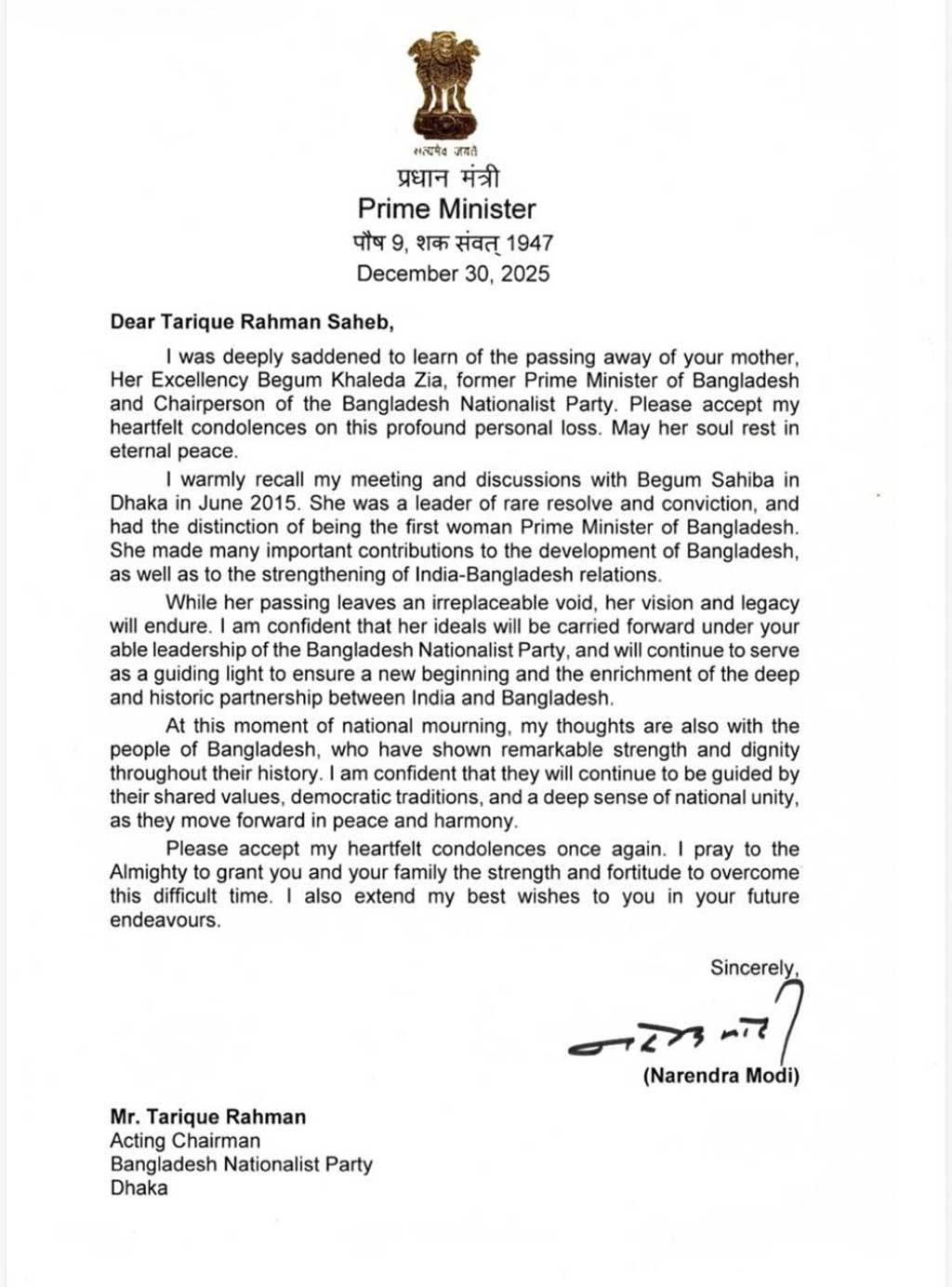 মেলবোর্ন, ১ জানুয়ারি- বিএনপির চেয়ারপারসন ও সাবেক প্রধানমন্ত্রী বেগম খালেদা জিয়ার মৃত্যুতে গভীর শোক জানিয়ে তাঁর ছেলে ও বিএনপির ভারপ্রাপ্ত চেয়ারম্যান তারেক রহমানকে চিঠি লিখেছেন…