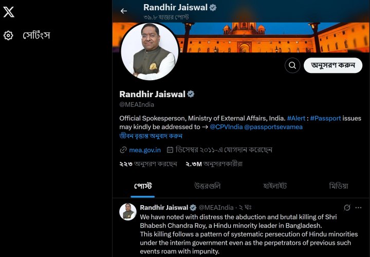 বাংলাদেশের হিন্দু নেতা ভবেশ চন্দ্র রায়কে অপহরণ ও নৃশংসভাবে হত্যার তীব্র নিন্দা জানিয়েছেন ভারতের পররাষ্ট্র মন্ত্রণালয়ের মুখপাত্র রণধীর জয়সওয়াল। শনিবার (১৯ এপ্রিল) সামাজিক যোগাযোগমাধ্যম এক্সে…