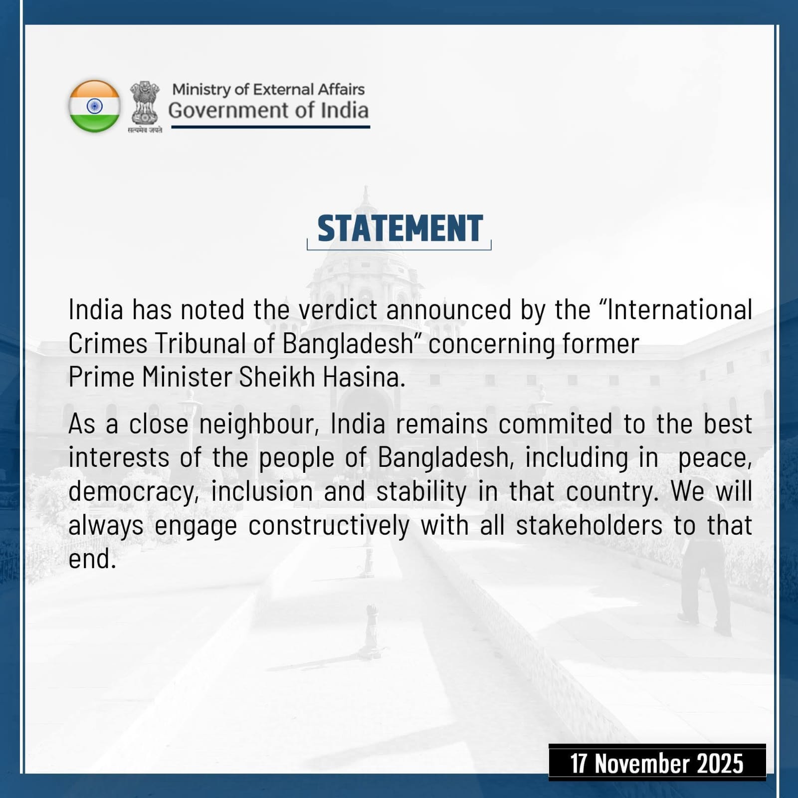 মেলবোর্ন, ১৮ নভেম্বর- বাংলাদেশের সাবেক প্রধানমন্ত্রী শেখ হাসিনাকে অনুপস্থিতিতে বিচার করে মৃত্যুদণ্ড দেওয়ার পর নয়াদিল্লি আনুষ্ঠানিক প্রতিক্রিয়া জানিয়েছে। ভারতের পররাষ্ট্র মন্ত্রণালয়ের নিয়মিত ব্রিফিংয়ে প্রকাশিত এই…