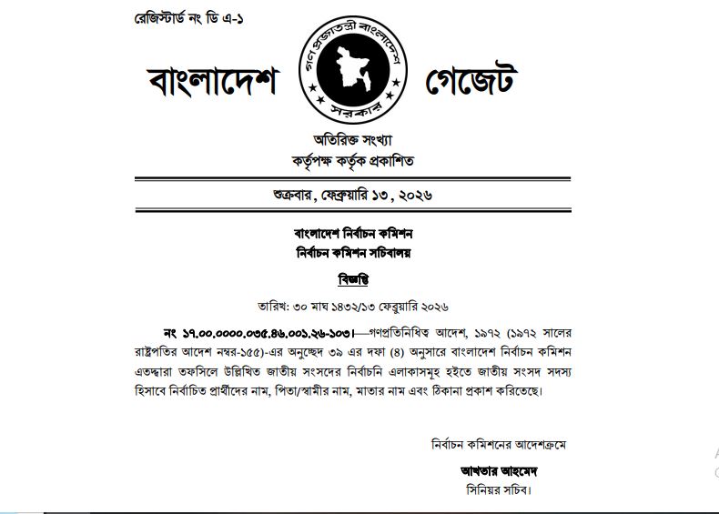 নবনির্বাচিত ২৯৭ জন সংসদ সদস্যের ফলাফলের গেজেট প্রকাশ