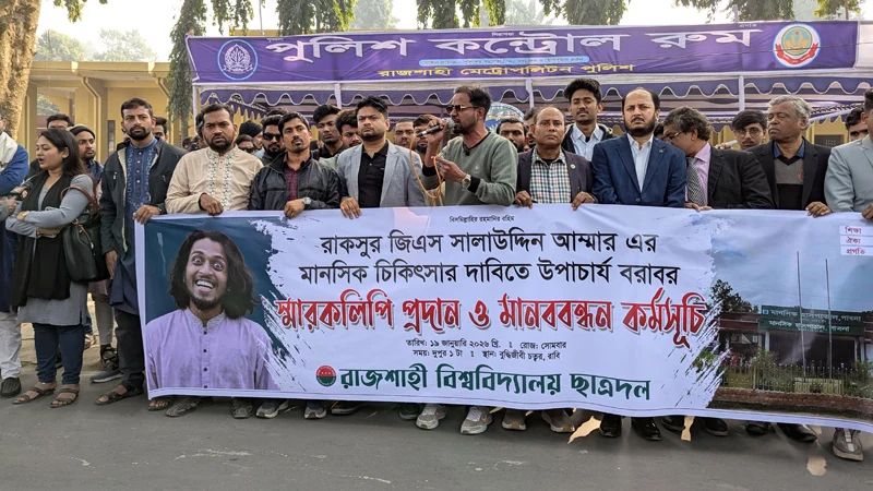 রাবির জিএস আম্মারের আম্মারের মানসিক চিকিৎসার দাবিতে মানববন্ধন
